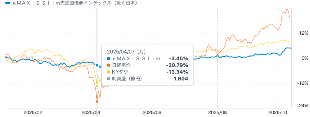 一方、「eMAXIS Slim先進国債券インデックス(除く日本)」は3%の下落でした。