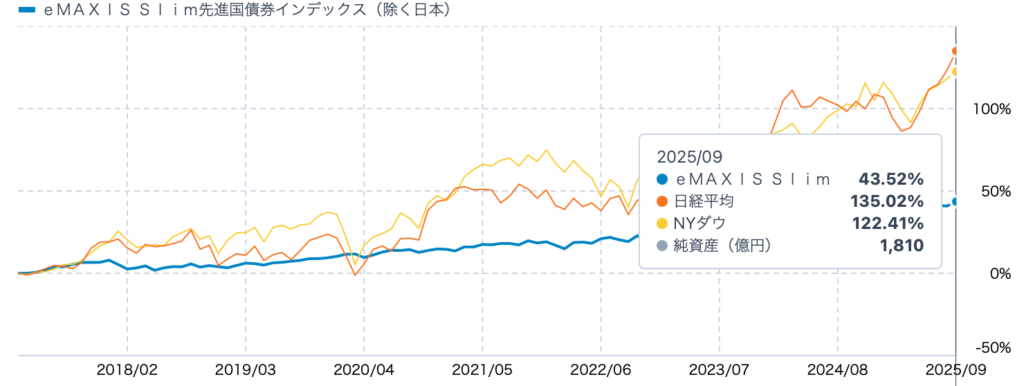 2017年2月に設定されてから今(2025年9月)まで43%上昇しています。(年複利で約4.2%)